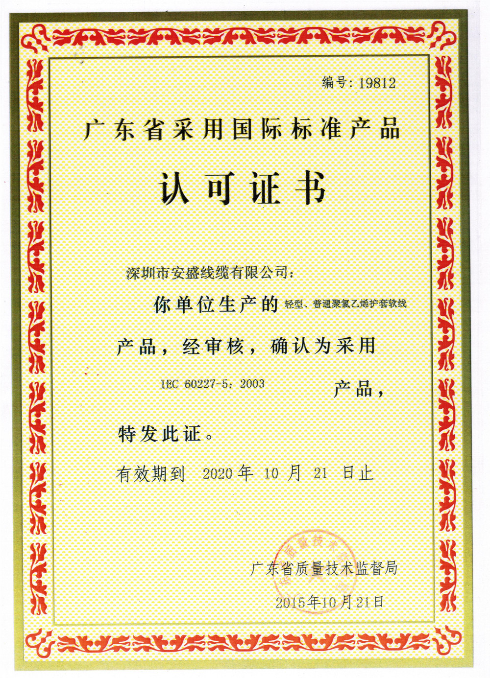 国际标准产品认可证书